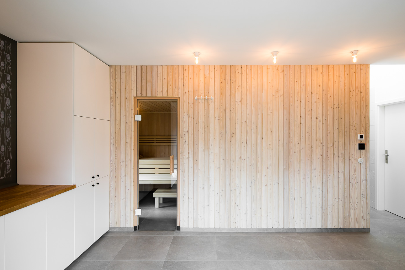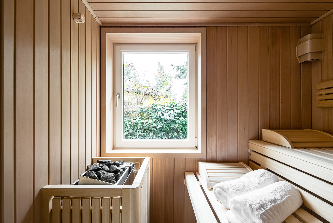 Der Übereck-Blick aus dem neu gestalteten Ruheraum der Sauna öffnet sich hin zum eigenen Blumengarten. Ein großes Oberlicht bringt Tageslicht in die fensterlosen Bereiche.