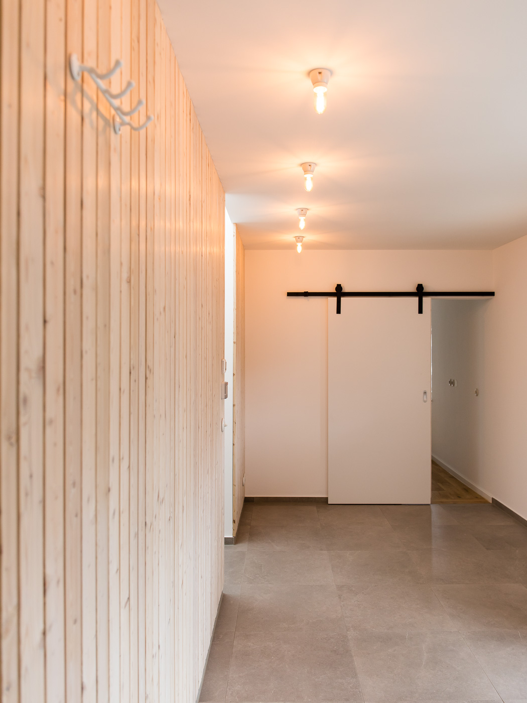 Gestaltprägende bauzeitliche Elemente werden bewusst mit modernen kombiniert. Holzschalung, technisches Porzellan sowie die Walzenmaltechnik treffen beispielsweise auf Großformatfliesen und bedrucktes Glas. Hiermit konnten wir die klare und individuelle Gestaltung jedes einzelnen Raumes erzielen.