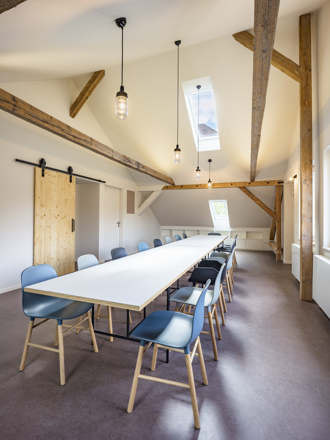 Hierfür wurde ein Teil des als Lager genutzten Dachbodens ausgebaut. Durch Öffnen des Giebelmauerwerks entsteht ein lichtdurchfluteter Raum mit einmaliger Quartiersperspektive.