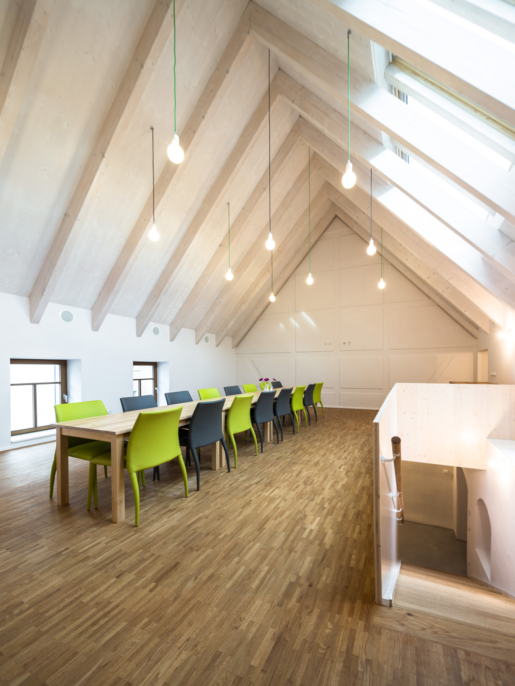 Für die Ladennutzung im Erdgeschoss wird die Deckenhöhe angehoben und der Raum von Einbauten befreit. Durch Zusammenlegung des vormals niedrigen Obergeschosses mit dem ungenutzten Dachboden entsteht ein hoher stützenfreier Raum, der die Dachform und seine Konstruktion erlebbar macht. Zusammen mit dem angebundenen Seitenflügel schafft diese neue Dachetage eine Bühne für die gewünschte Nutzungsvielfalt.