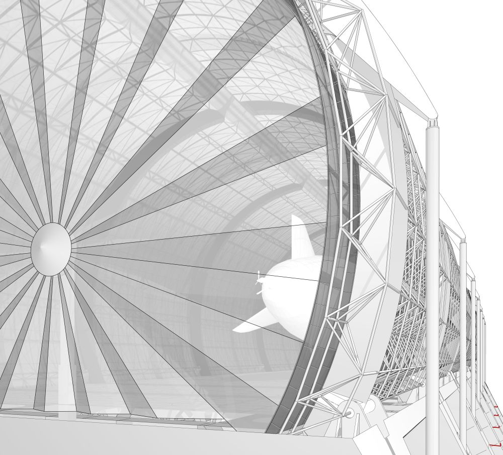 Um das Unfallrisiko beim Aus- und Einhallen des Luftschiffes zu minimieren, ist die Halle als komplett öffenbare Konstruktion geplant. Das peripher klappbare Dach ist mit einer Vertikalbewegung der eigentlichen Plattform gekoppelt, um den Start- und Landevorgang zu inszenieren und eine freie Sicht der Passagiere an Deck zu gewährleisten. Beide Bewegungen sind gegenläufig. Der Öffnungsmechanismus des Hallendaches besteht aus einem viergliedrigen Getriebe, dessen Antrieb von Hydraulikzylindern übernommen wird. Über einen Pleuel wird die Plattform angehoben; eine Scherenkonstruktion hält die Plattform in Position und dient als zusätzliches Auflager.