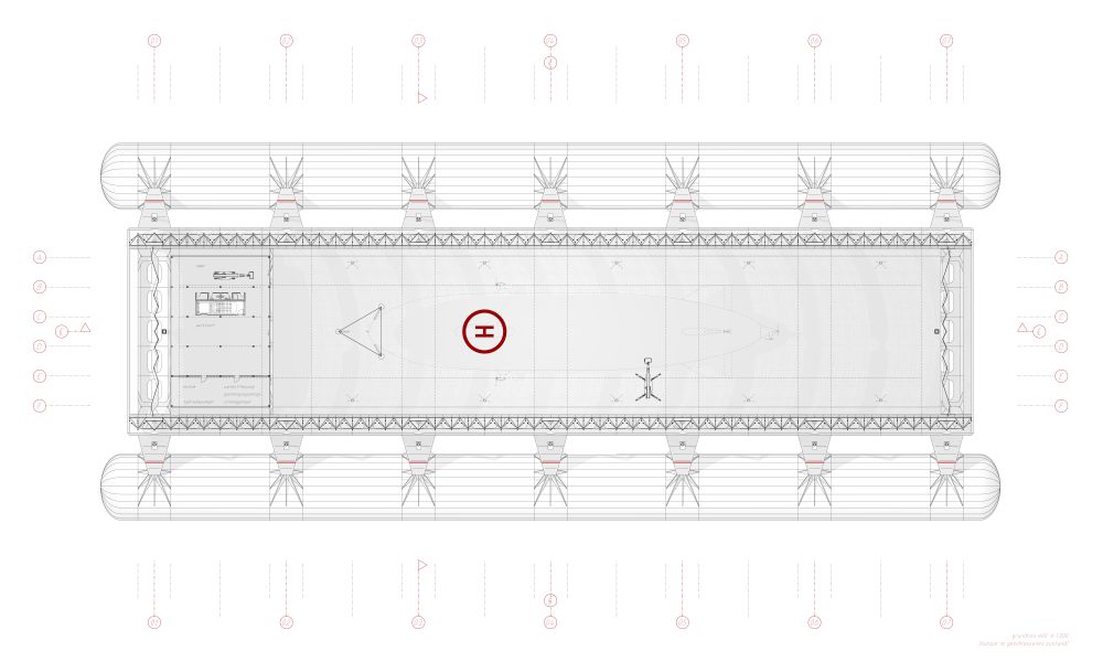 Der Entwurf sieht für die Schwimmfunktion eine Konstruktion des aus der Meerestechnik bekannten Typs des Halbtauchers vor. Über Ballastwasser, das in die Hauptauftriebskörper gepumpt wird, kann die Eintauchtiefe geregelt werden. Die voluminösen Stützen dienen als Restauftriebskörper für verschiedene schnell wechselnde Lasten (z. B. Wind). Die geringe Wasserlinienfläche der Stützen sorgt für eine erhöhte Kippsicherheit und Querstabilität des Hangars. Das Gebäude wird in der für die Meerestechnik typischen Spantenbauweise ausgeführt.
