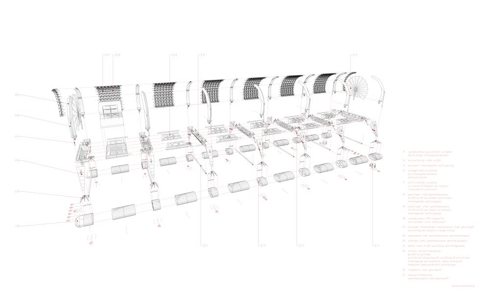 Im Schnitt zeigen sich die gegenläufigen Bewegungen des Hallendaches und der Plattform -
