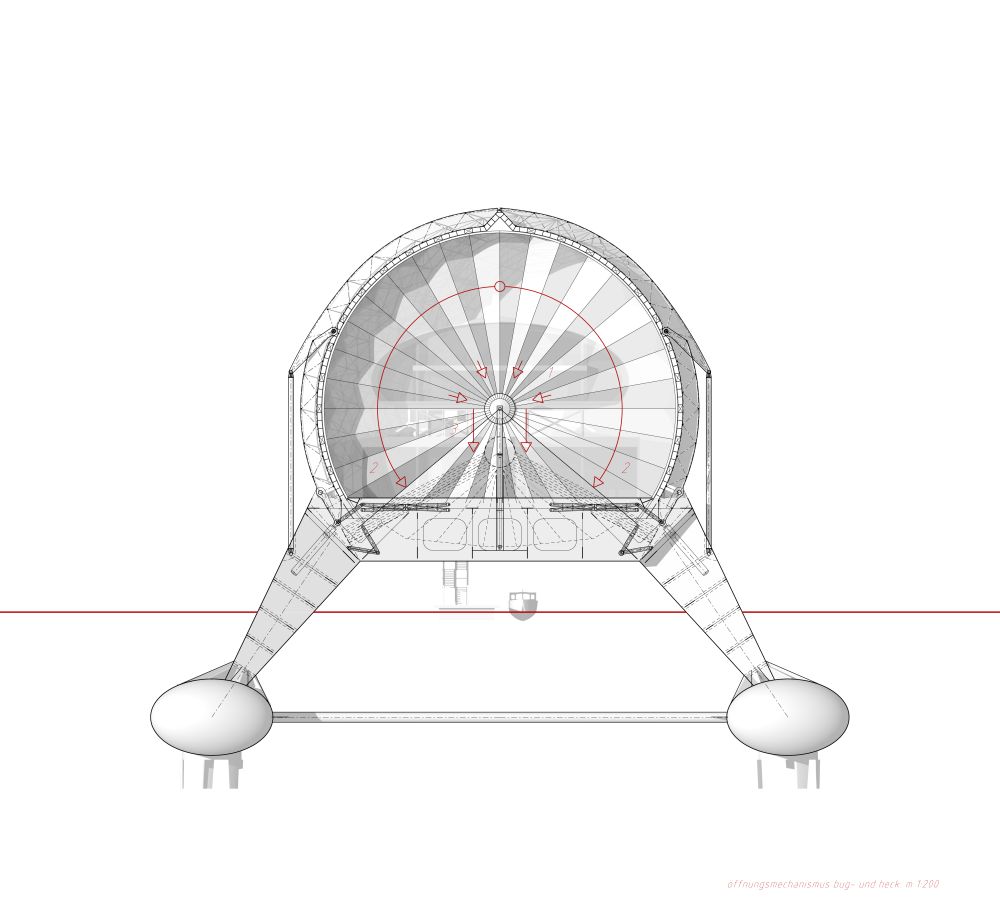 Die Bug- und Heckabschlüsse sind als zirkulär faltbare glasklare Acrylglasfassaden konzipiert. Die Fassade teilt sich im Scheitelpunkt und wird mittels Traktoren zu den unteren Auflagern geführt. Eine Hydraulik senkt das nun vorhandene Fassadendreieck unter die Plattformoberkante.
