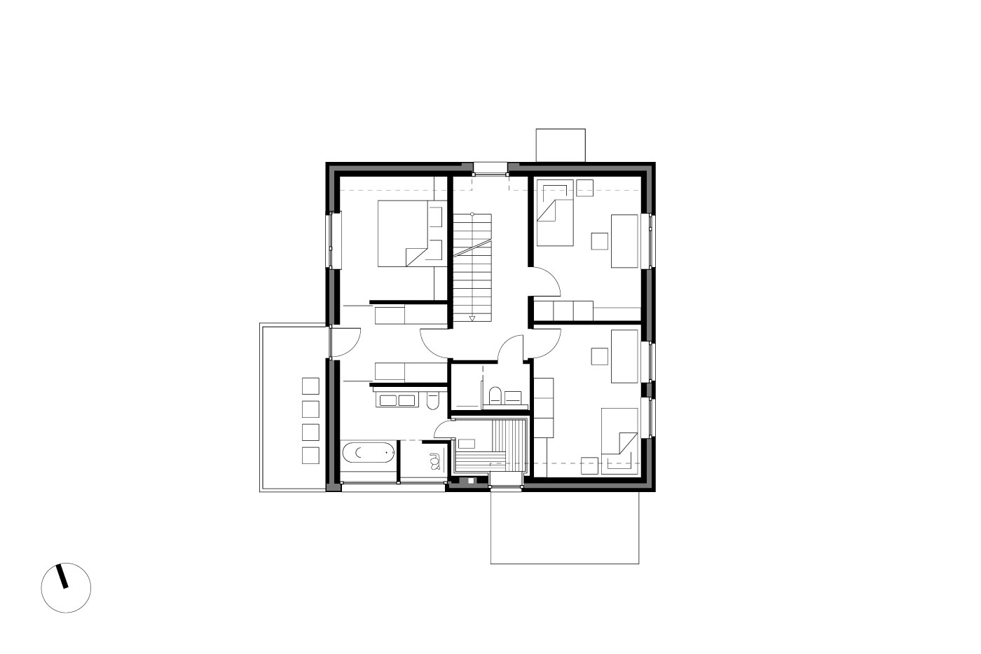 Dies ist ein typisches Einfamilienhaus. Auf den ersten Blick. Doch auf den zweiten zeigt es sein kreatives Spiel mit Räumen und Flächen. Für die Eltern gibt es einen eigenen Bereich mit Ankleide, Sauna und Balkon zum anschließenden Abkühlen.