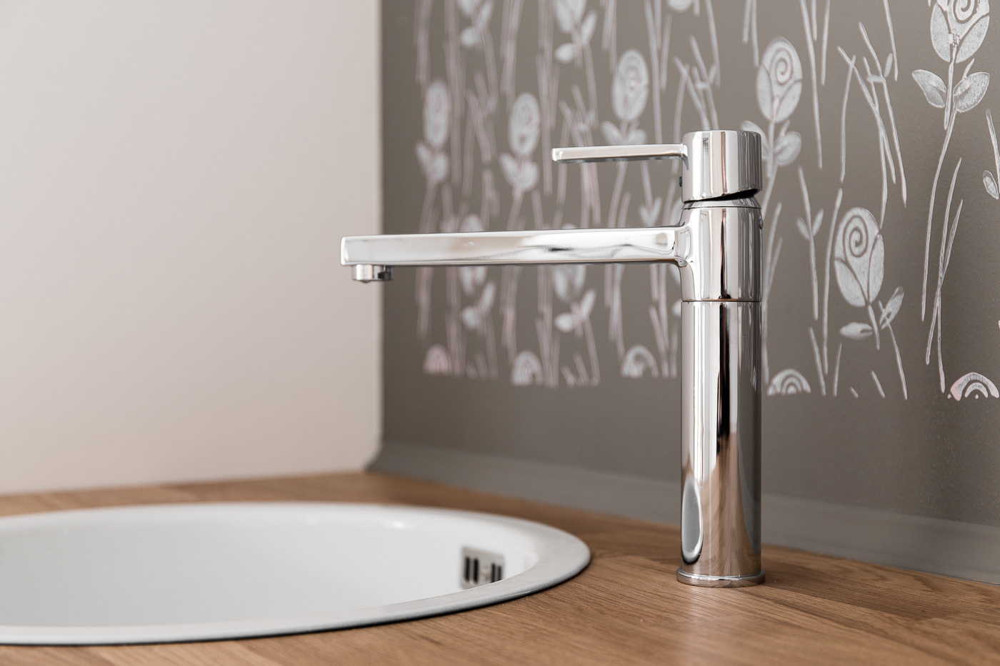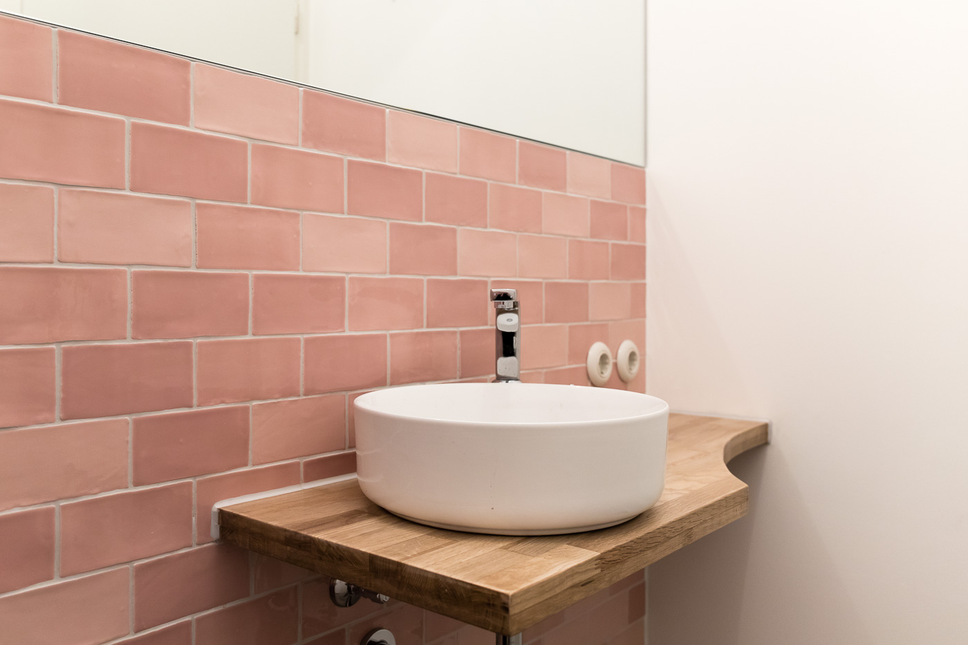 Gestaltprägende bauzeitliche Elemente werden bewusst mit modernen kombiniert. Holzschalung, technisches Porzellan sowie die Walzenmaltechnik treffen beispielsweise auf Großformatfliesen und bedrucktes Glas. Hiermit konnten wir die klare und individuelle Gestaltung jedes einzelnen Raumes erzielen.