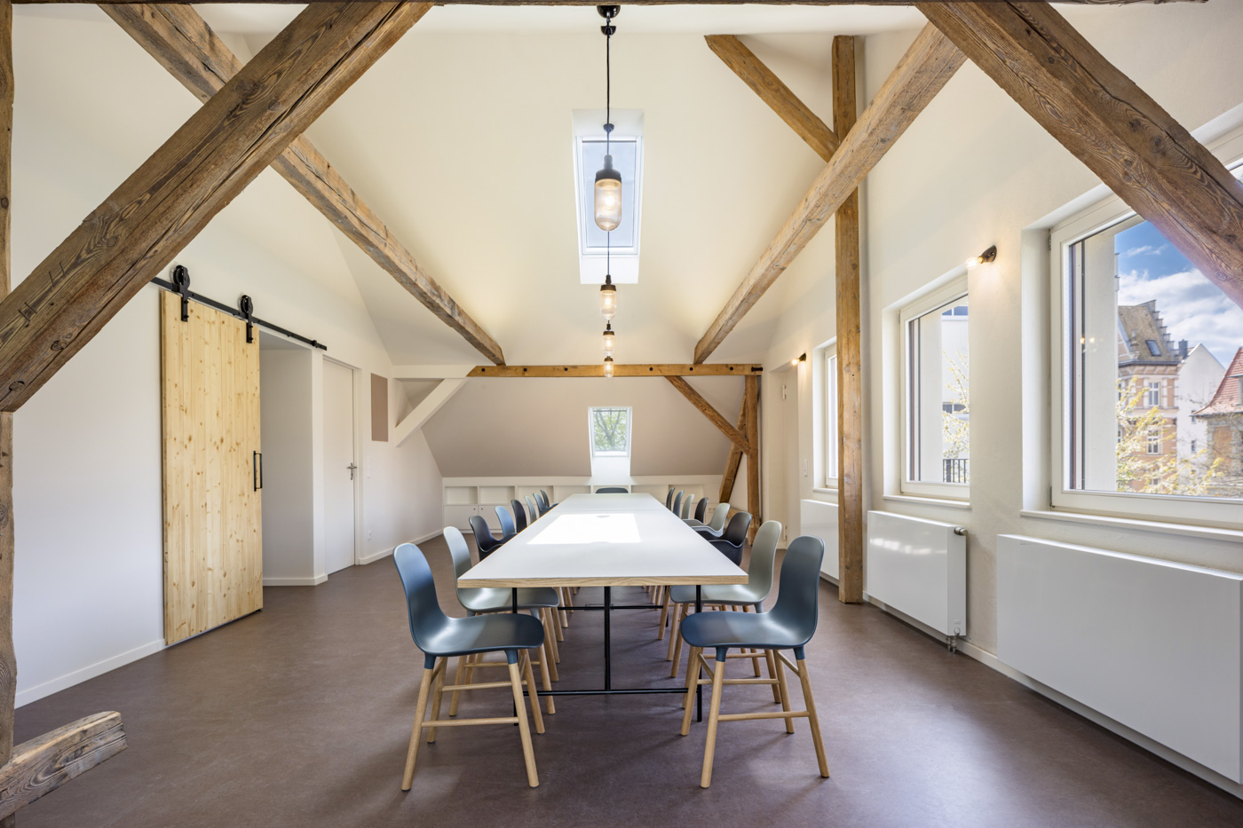 Hierfür wurde ein Teil des als Lager genutzten Dachbodens ausgebaut. Durch Öffnen des Giebelmauerwerks entsteht ein lichtdurchfluteter Raum mit einmaliger Quartiersperspektive.