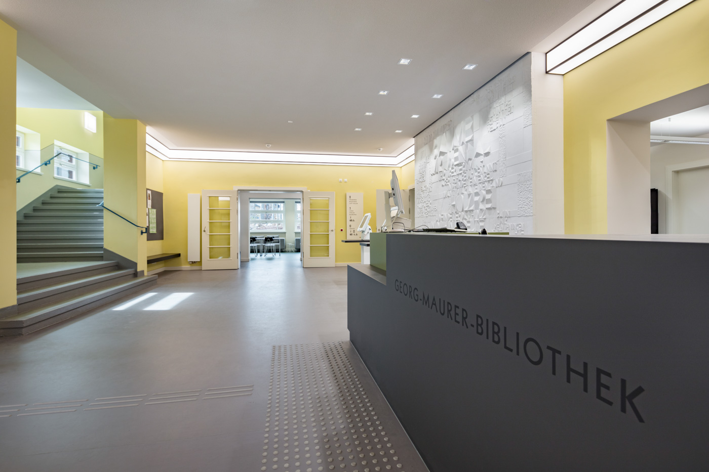 Die freigelegte bauzeitliche Farbfassung markiert den Ausgangspunkt für das Gesamtkonzept der innenräumlichen Gestaltung. Neue Raumelemente und Möbel stehen im spannungsvollen Kontrast zum Bestand und unterstützen die ansprechende Präsentation der ca. 36.000 Medien.