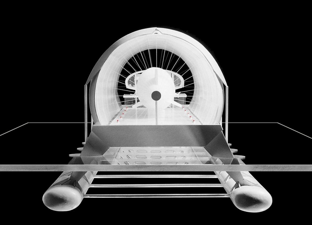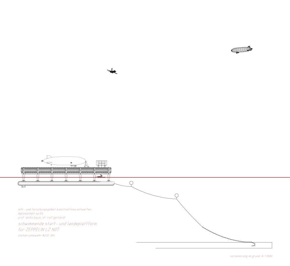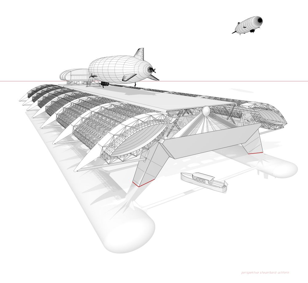 Entwurf eines schwimmenden Luftschiffhangars auf dem Bodensee für den seit 1997 gebauten Zeppelin LZ N07. Auf Vorfertigung und Export angelegte Bauweise. Konzept einer vollständig öffenbaren Halle; Inszenierung des Wandelvorgangs; Idee einer freien Plattform.