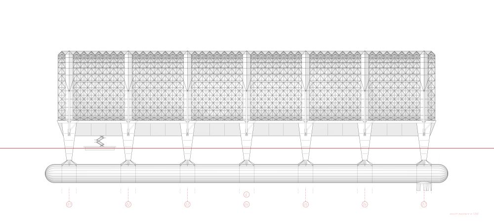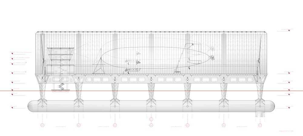 Der Entwurf sieht für die Schwimmfunktion eine Konstruktion des aus der Meerestechnik bekannten Typs des Halbtauchers vor. Über Ballastwasser, das in die Hauptauftriebskörper gepumpt wird, kann die Eintauchtiefe geregelt werden. Die voluminösen Stützen dienen als Restauftriebskörper für verschiedene schnell wechselnde Lasten (z. B. Wind). Die geringe Wasserlinienfläche der Stützen sorgt für eine erhöhte Kippsicherheit und Querstabilität des Hangars. Das Gebäude wird in der für die Meerestechnik typischen Spantenbauweise ausgeführt.