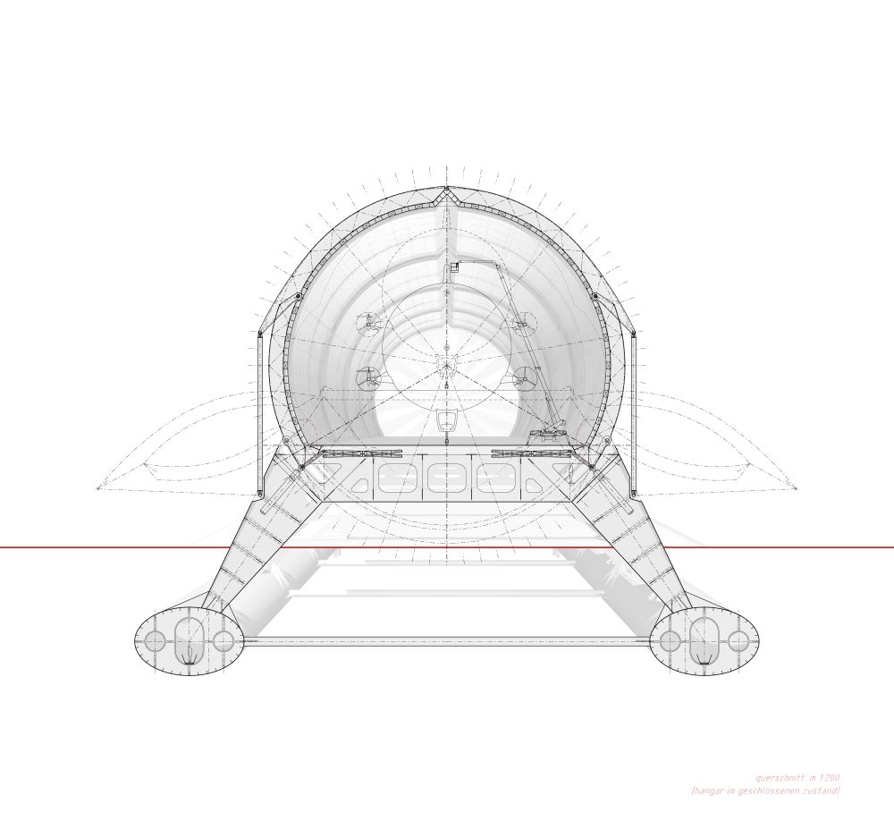 Um das Unfallrisiko beim Aus- und Einhallen des Luftschiffes zu minimieren, ist die Halle als komplett öffenbare Konstruktion geplant. Das peripher klappbare Dach ist mit einer Vertikalbewegung der eigentlichen Plattform gekoppelt, um den Start- und Landevorgang zu inszenieren und eine freie Sicht der Passagiere an Deck zu gewährleisten. Beide Bewegungen sind gegenläufig. Der Öffnungsmechanismus des Hallendaches besteht aus einem viergliedrigen Getriebe, dessen Antrieb von Hydraulikzylindern übernommen wird. Über einen Pleuel wird die Plattform angehoben; eine Scherenkonstruktion hält die Plattform in Position und dient als zusätzliches Auflager.